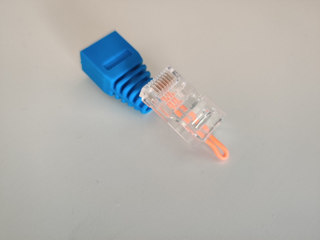 Since this was a quick hack, I only used a single wire from a network cable. This means the strain relief boot cover (what a mouthful) ie, the blue thing, is just barely hanging on to the edge of the connector instead of being wrapped around a cable and will fall off easily.