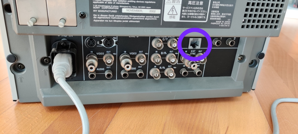 So, how do we turn it on? Given it was designed to be a signal from an outside device, there is no actual button to turn it on. The signal is received via the "Parallel remote terminal" located at the back of the monitor (purple circle).