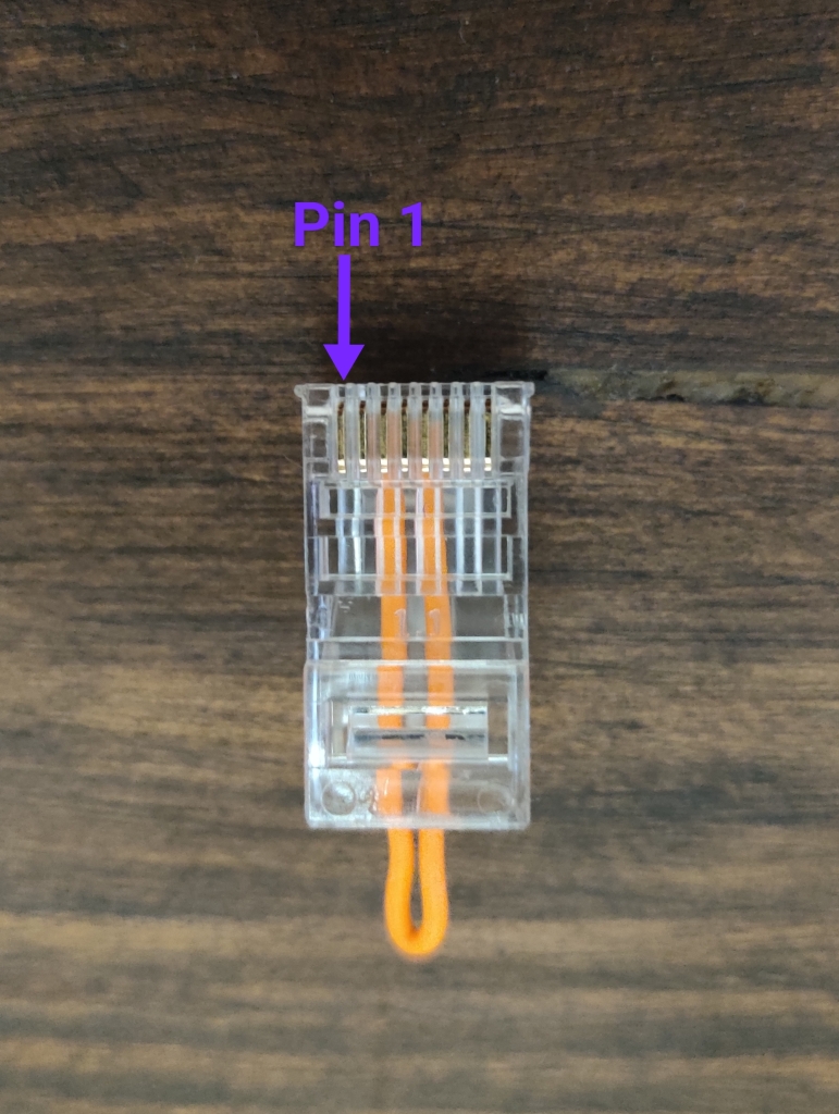 So, how does this work in real life? Grab a RJ-45 connector, a tiny bit of network cable (cat5/cat6/cat7 or even an old telephone cable will work) and align as shown: connector release button facing down and count left to right: pin 3 and 5. Crimp with a crip tool.